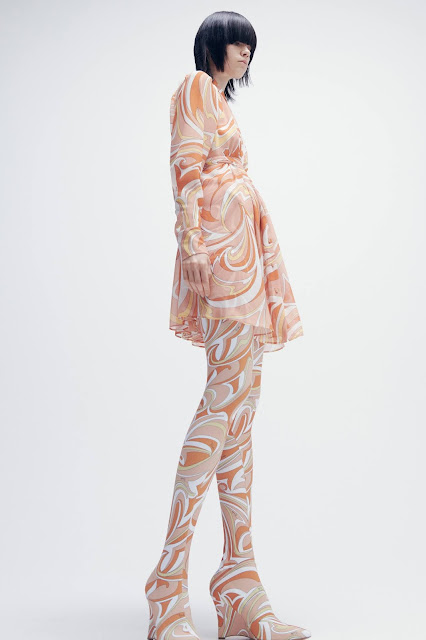 A modernidade impregna a ideia de um guarda-roupa modular, de peças separadas, que podem ser combinadas de maneiras infinitas de acordo com as vontades individuais. Jaquetas bomber acolchoadas, blusĂ”es e shorts curtos, polos e bodysuits em jacquard de mohair, tĂșnicas e casacos dupla face, macacĂ”es, vestidos plissados leves e vestidos de chiffon com transparĂȘncias, decorados com cristais e penas sĂŁo os destaques de uma coleção que carrega todo o DNA da Emilio Pucci, infundido com tons de marfim, amarelo, rosa, laranja, nude e petrĂłleo. Os mesmos tons caracterizam as estampas Cervinia, Cortina d'Ampezzo, Specchi, Clessidra, Nuages e Nappine: prints e desenhos icĂŽnicos, direto dos arquivos da Pucci foram atualizados e dessaturados.